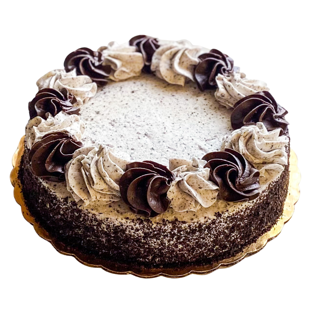 Chocolate cake meets cookie-and-cream in this customer favorite. Soft chocolate layers are frosted with a sandwich cookie buttercream and finished with swirls of rich chocolate and cookies-and-cream frosting on top. The sides are rolled in cookie crumbs for extra crunch and eye appeal. Available as both a double layer centerpiece cake and a single layer everyday option.