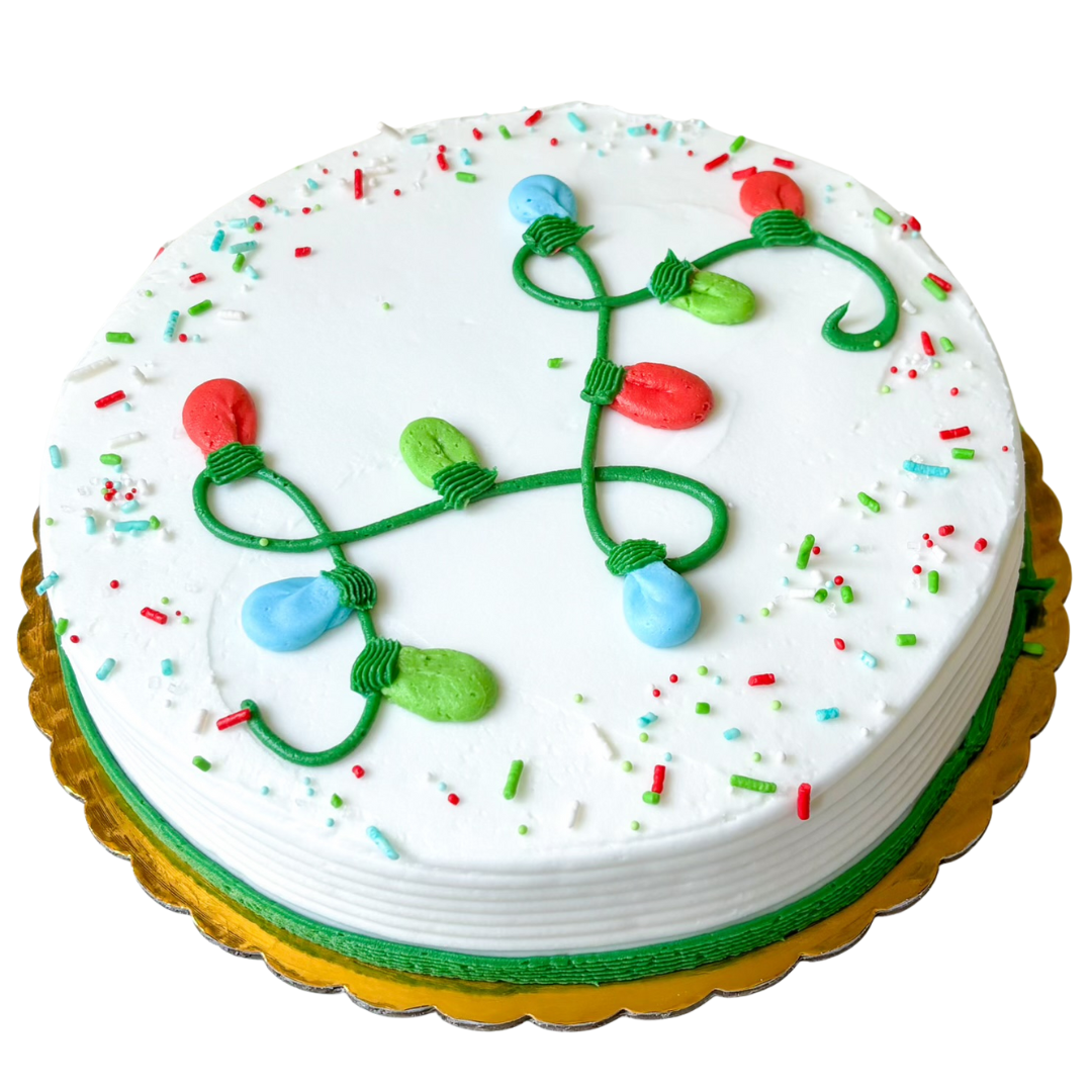 Bright, cheerful, and ready for the holidays. This single-layer 8" round cake features a smooth white buttercream base with a hand-piped string of classic Christmas lights in red, green, and blue. Finished with fluffy white rosettes, a festive scatter of sprinkles, and a clean green buttercream trim, it’s a joyful and eye-catching centerpiece for any holiday display.